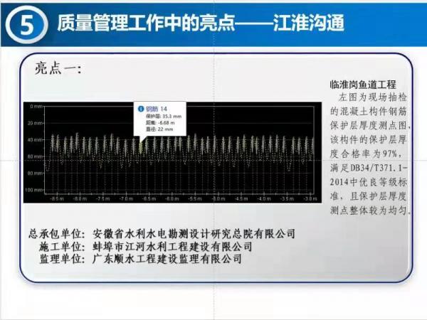 8月17日,引江濟淮集團公司召開8月份質(zhì)量安全視頻會,會上,蚌埠江河公司承建的臨淮崗魚道工程混凝土鋼筋保護層作為亮點在視頻會上交流。